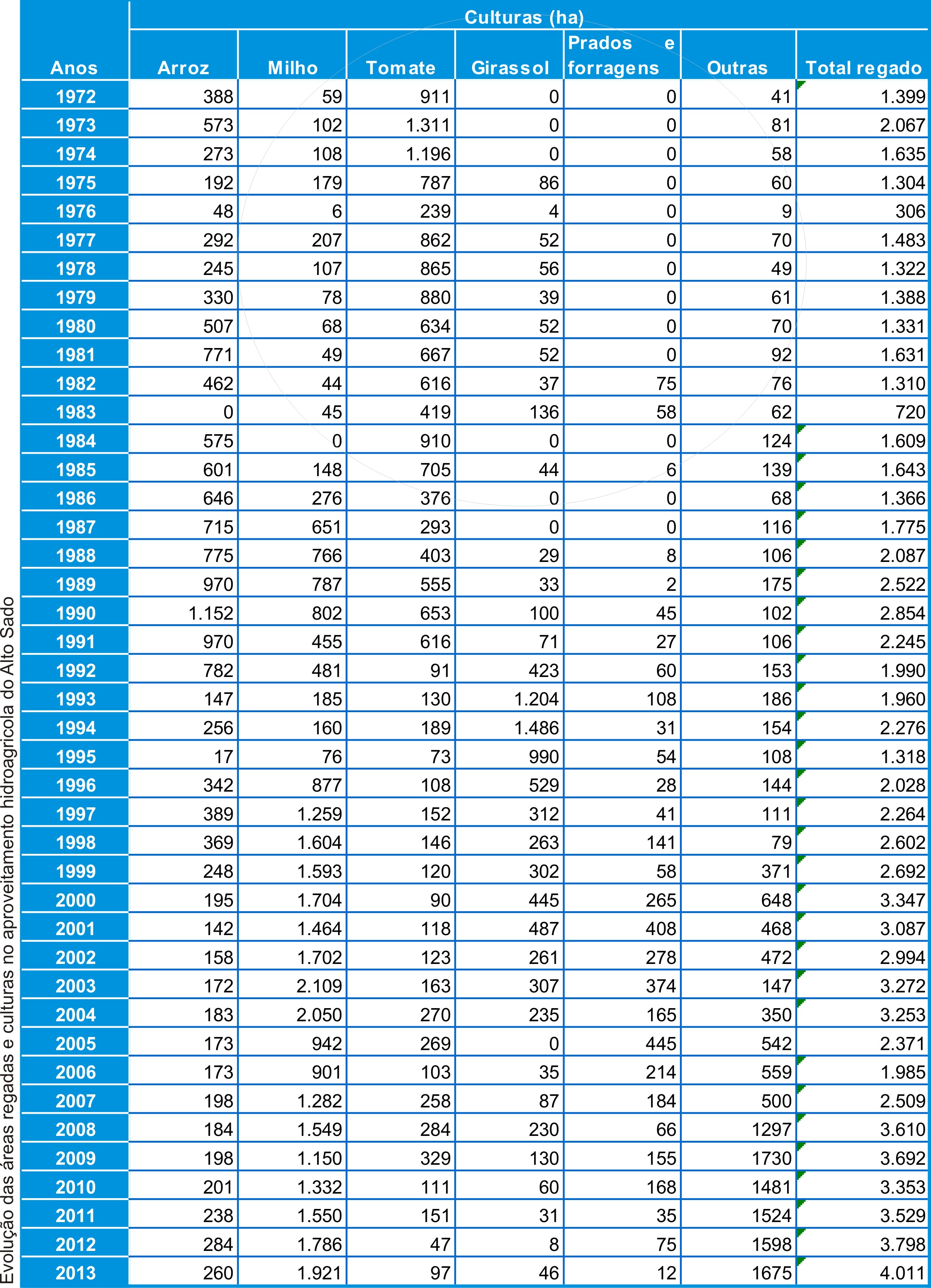 O Aproveitamento Hidroagricola do Alto Sado entrou em funcionamento em 1972. Esta obra de rega beneficia directamente uma área de 3.683 ha, a qual é servida por uma rede de rega com um desenvolvimento total de 183.469m . A água é conduzida ao longo da margem direita do Rio Sado, desde a Albufeira até ás proximidades de Alvalade, pelo Canal Condutor Geral, com um desenvolvimento aproximado de 44Km. A ligação entre este aproveitamento e o aproveitamento de Campilhas e S.Domingos foi concretizada com a construção de um distribuidor de ligação entre o canal de Alvalade e o canal condutor geral de Campilhas, em local que domina 206ha antes regados apenas a partir da albufeira de Campilhas. O desenvolvimento da rede de rega totaliza 183.469m, repartidos por 59.952m de canais principais, 12.950m de distribuidores e 110.567m de regadeiras. São numerosas as obras de arte englobadas na rede de rega, das quais se destacam 15 pontes canais (4.225Km), 9 sifões (3.590m), 148 pontões, 80 passadiços e 255 aquedutos. A rede de enxugo envolve 18 coletores, totalizando uma extensão de 36.231m.