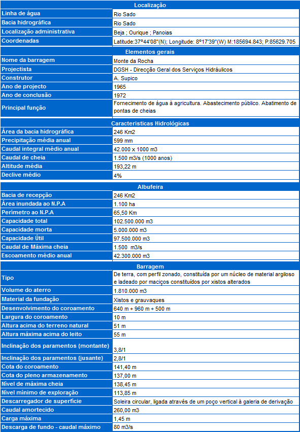 A albufeira do Monte da Rocha, inaugurada no dia 11 de junho de 1972, constituíu a primeira das obras da 2ª fase do plano de rega do Alentejo a ser iniciada e concluída. Os projectos e todos os elementos da Obra de Rega do Alto Sado foram da responsabilidade da Direcção-Geral dos Serviços Hidráulicos. As principais funções desta albufeira são o abatimento de pontas de cheias, o fornecimento de água à agricultura e à indústria, assim como o fornecimento de água para abastecimento a diversas povoações. As principais características da barragem e da albufeira do Monte da Rocha são as referidas nos quadros seguintes: